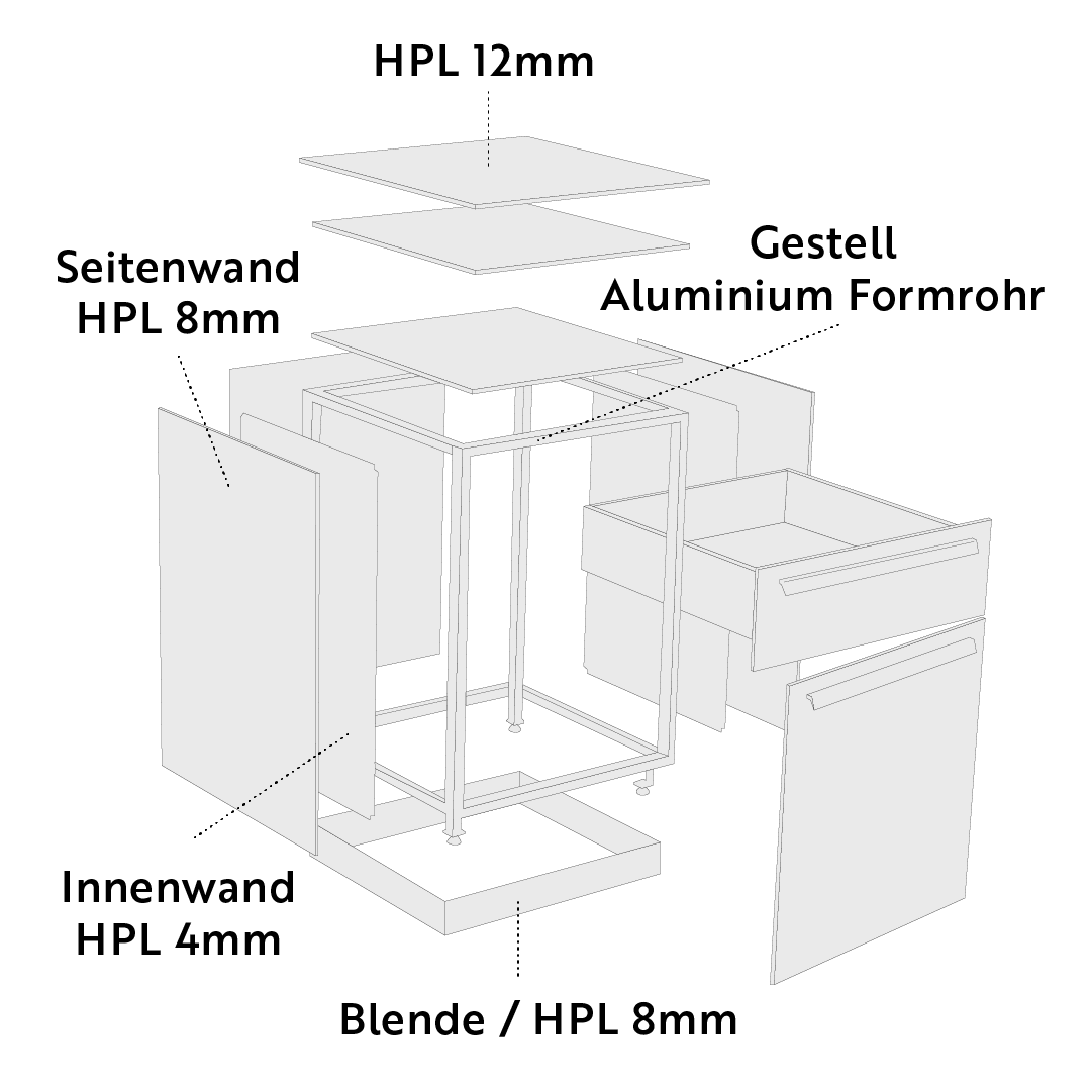 Alle Platten bestehen aus robustem HPL. Pflegeleicht und dampfstrahlgeeignet.