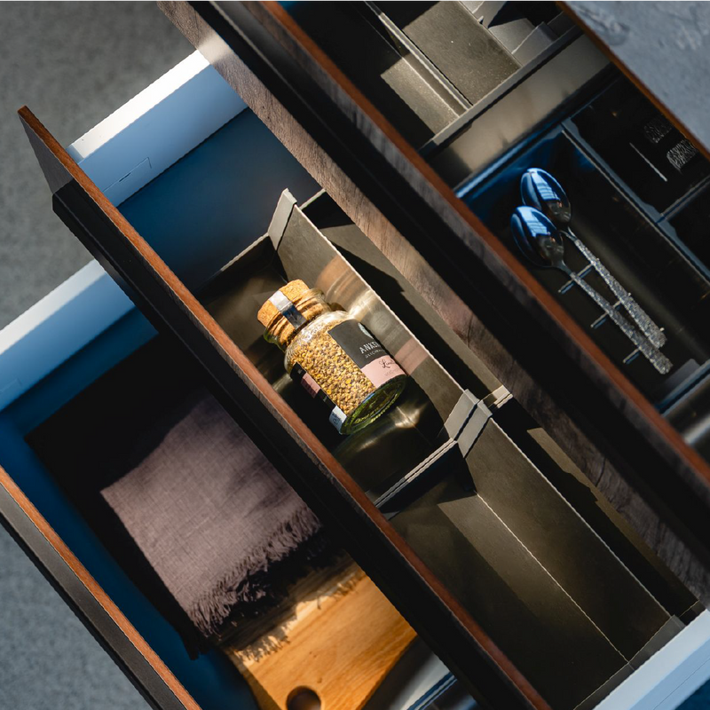 Vier leise laufende Soft Close Schubladen mit hoher Tragkraft. Ideal für Besteck, Tools und Zubehör. Optional mit Einsätzen für strukturierte Ordnung.