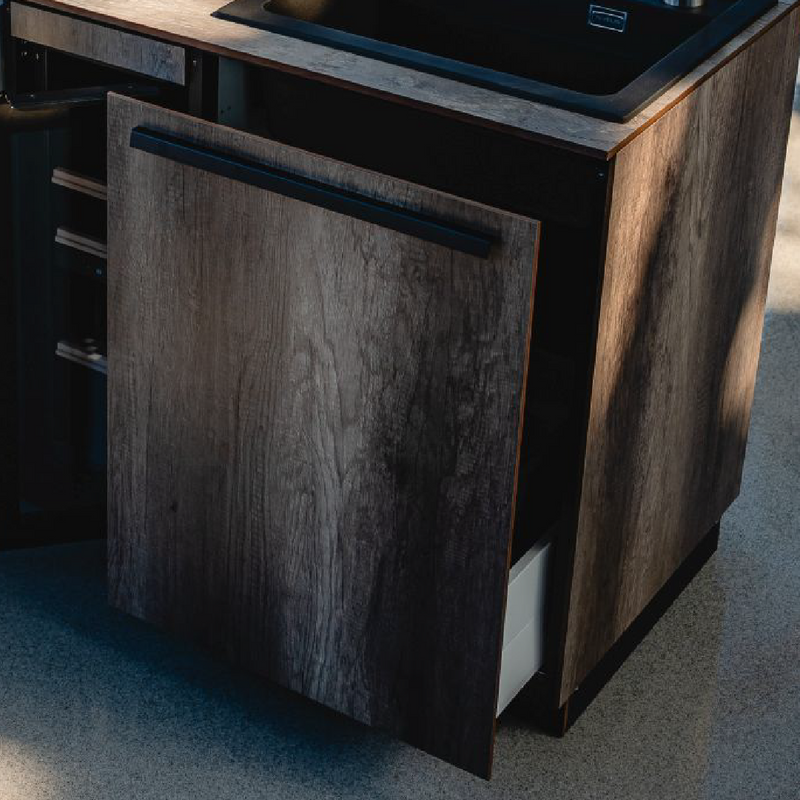 Kombiniert Tür und Schublade in einem Modul. Frei wählbarer Türanschlag. Sanftes Soft Close für alle Elemente. Maximale Flexibilität auf kompaktem Raum.