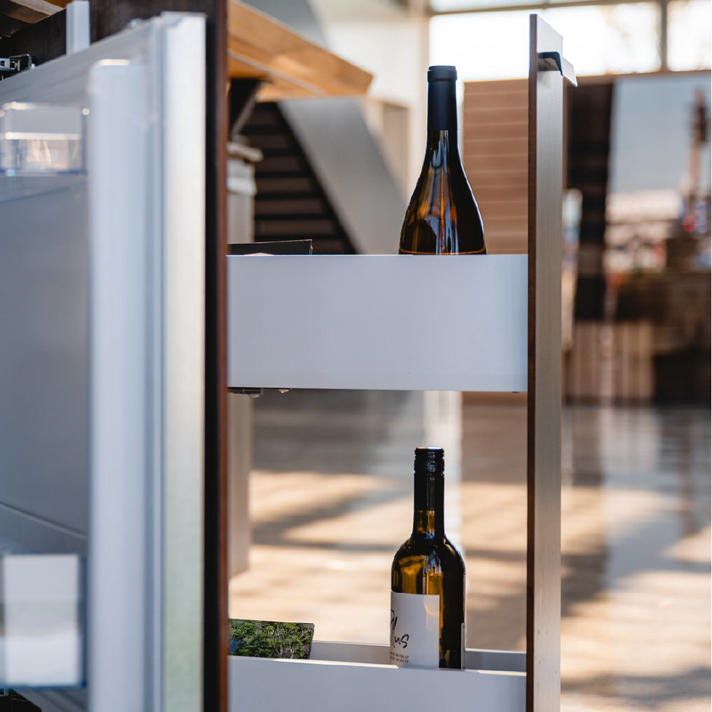 Geeignet für Öl, Essig oder Getränke. Zwei leise laufende Soft-Close-Führungen und seitliche Fixierung sorgen für stabilen Halt. Ruhiges Öffnen auch bei Glasflaschen.